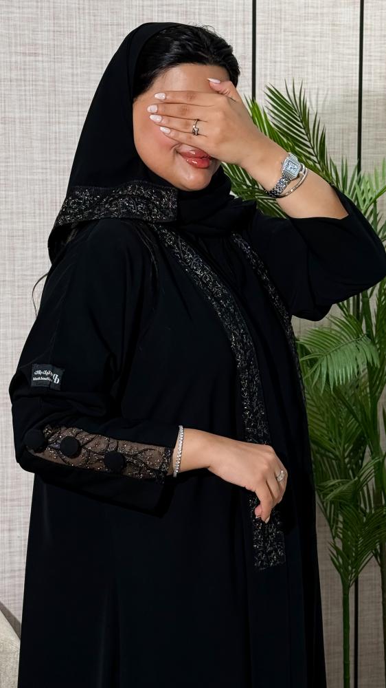 القماش: كريب نواعم كوري اسود مع دانتيل مطرز لون ذهبي