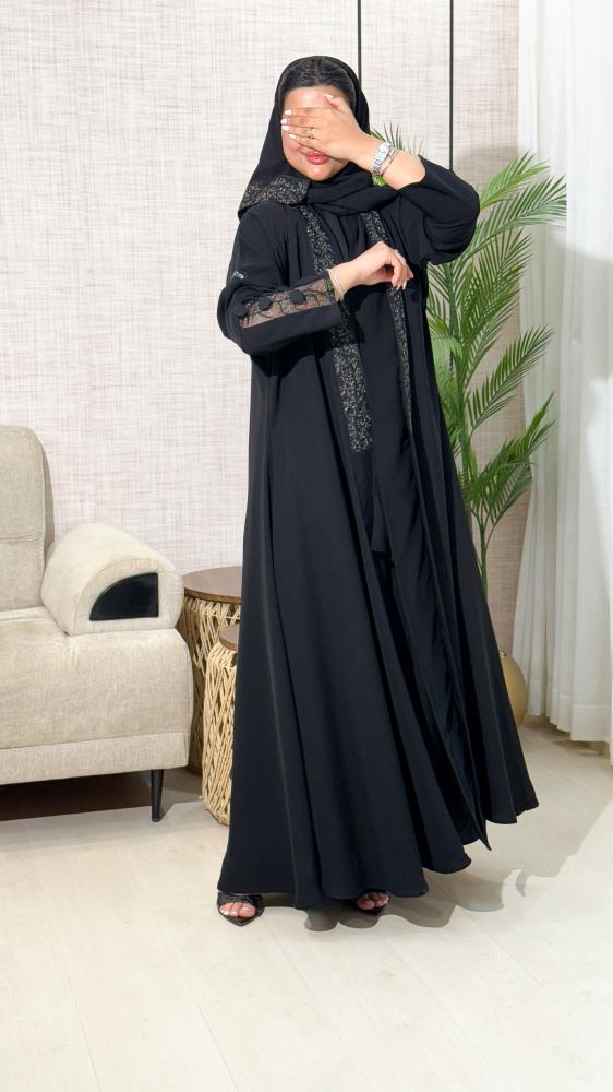 التفاصيل: نص كلوش مع تدخيلات دانتيل مطرز ذهبي من الامام والاكمام