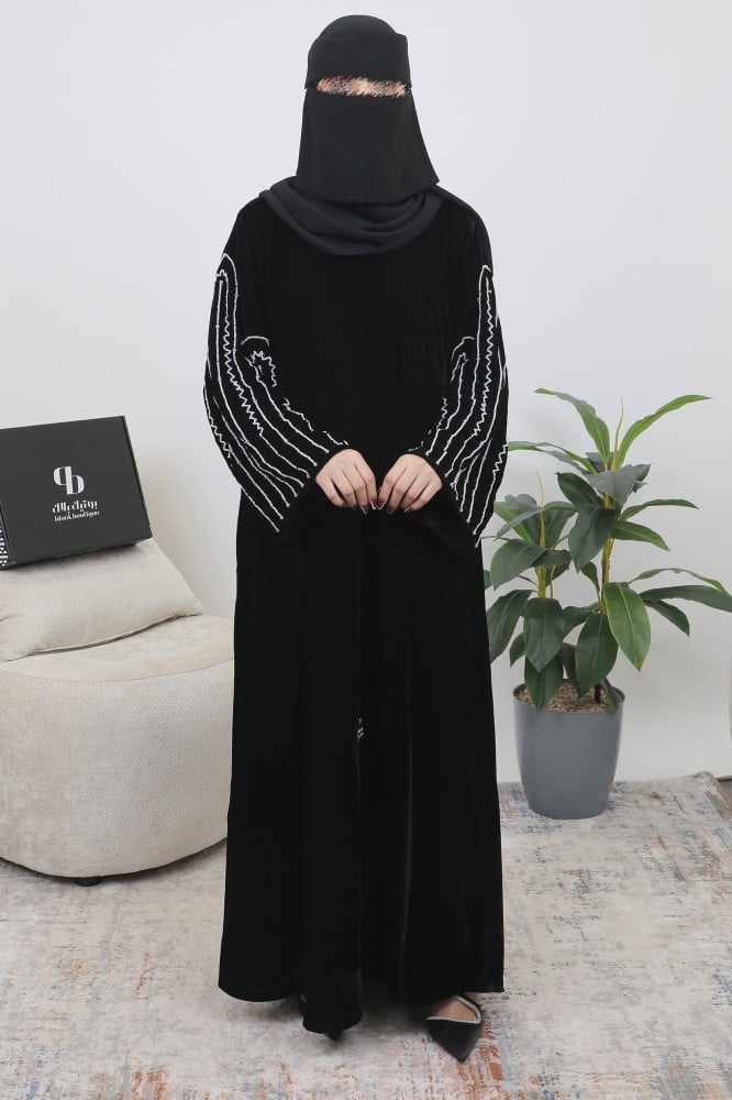 - جودة القماش : تتميز هذه العباية بتصنيعها من القماش المخمل عالي الجودة، الذي يمنحها ملمسًا ناعمًا ومظهرًا فاخرًا. كما أن القماش المخمل معروف بمتانته وقدرته على التهوية، مما يوفر شعورًا بالراحة أثناء الارتداء.