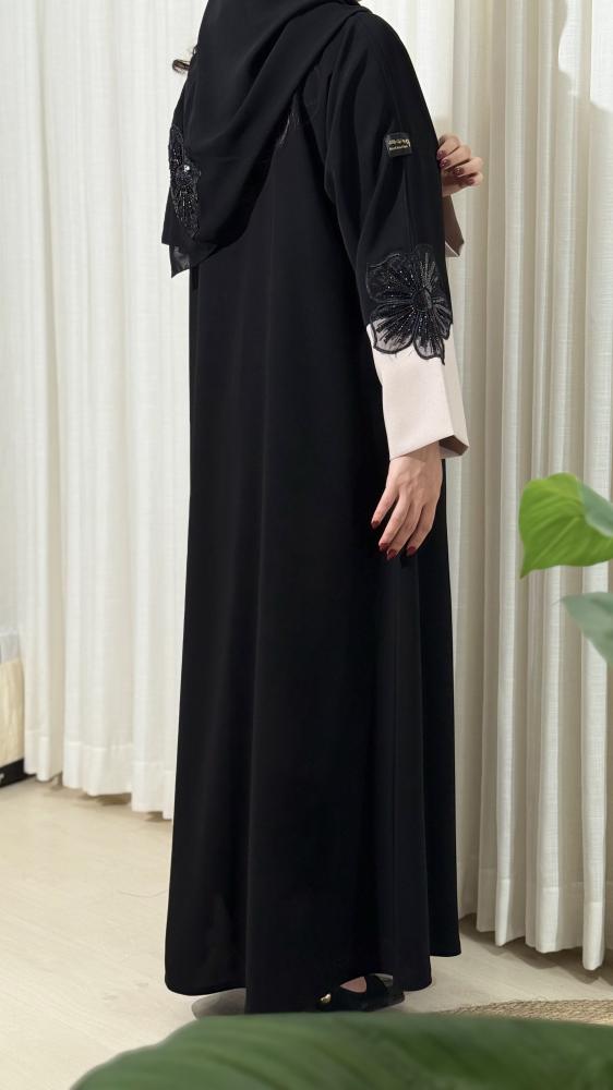 عباية نص كلوش بكم عادي وكلفة وردة – أناقة ناعمة بلون بيج تألقي بإطلالة أنثوية ناعمة مع هذه العباية المصممة بنص كلوش وأكمام عادية، مع لمسة فنية أنيقة من كلفة وردة تضيف سحرًا خاصًا لتفاصيل العباية.